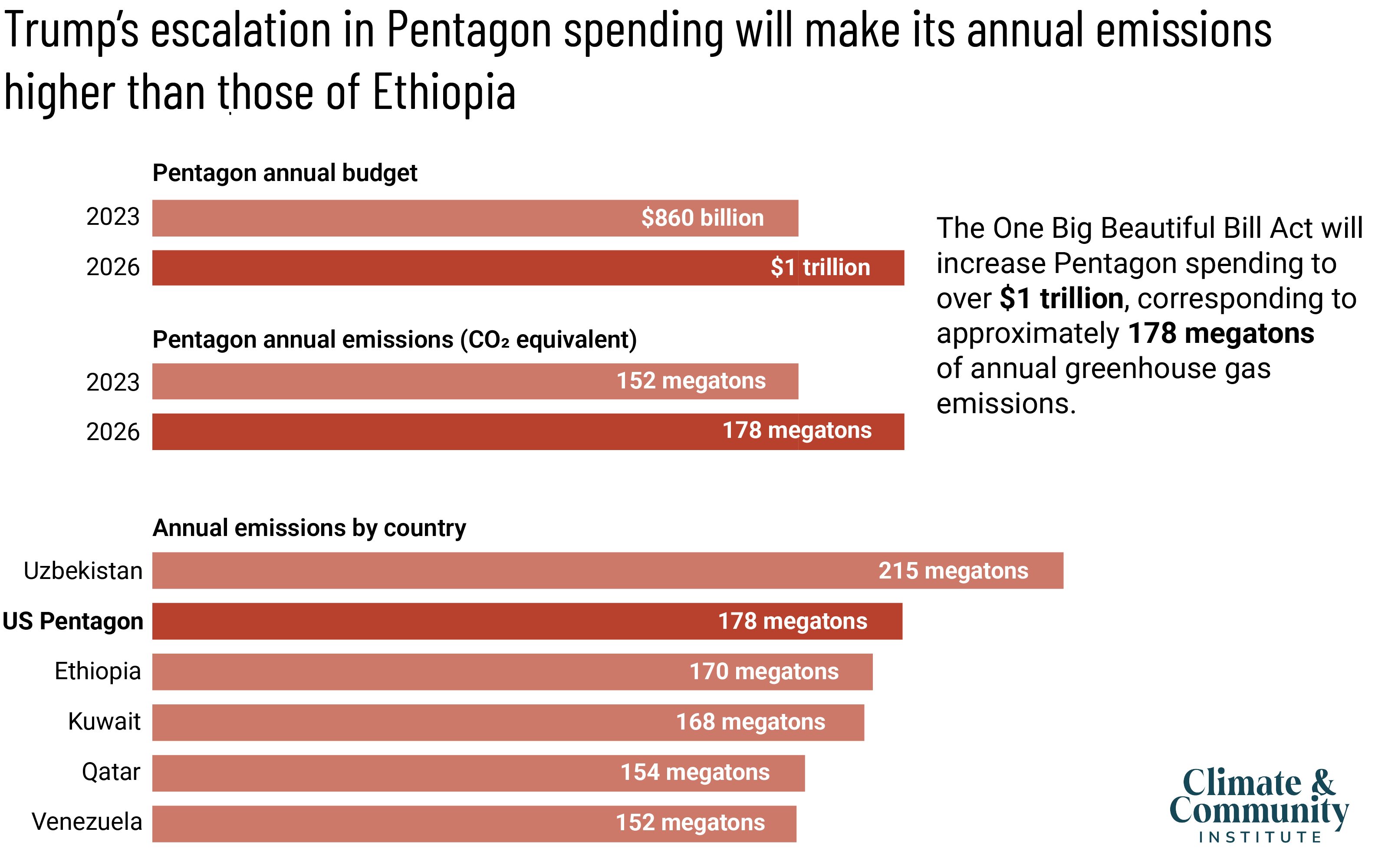 The U.S. military is the world’s largest institutional emitter of greenhouse gases. Its vast global operations—from jet fuel consumption and overseas deployments to domestic base maintenance—produce immense carbon pollution, as does the manufacturing of all the weapons, ships, and planes that it operates. Per the Transnational Institute, in 2023 the Pentagon spent approximately $860 billion, with carbon emissions estimated at nearly 152 megatons, including not just the Pentagon’s operations, but the full supply chain emissions from the U.S.’s vast Military Industrial Complex. The new Pentagon budget passed through the One Big Beautiful Bill Act grows beyond $1 trillion in 2026—a 17% increase.